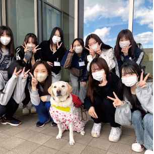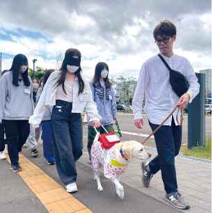 視覚障がい者の方の協力のもと、実践的な実技実習を体験。リハビリテーションを担う盲導犬の活躍について学びます。