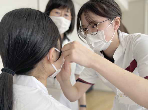 様々なメーカーのコンタクトレンズの種類・特徴の知識を得ます。患者さんへの正しい装用指導を目指し、実際にコンタクトレンズを合わせます。また、専門店舗へ見学にも行き理解を深めていきます。
