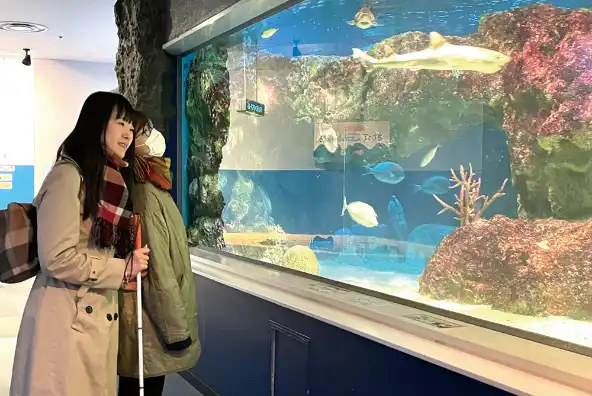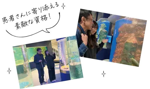患者さんにとって、安心・安全な援護をできる応用の資格(応用課程)を取得。視覚障がい者の方の介助や誘導で、実際に地下鉄の乗降の練習やお買い物をしたり、水族館などに一緒に出かけて援護のコツをつかみます。