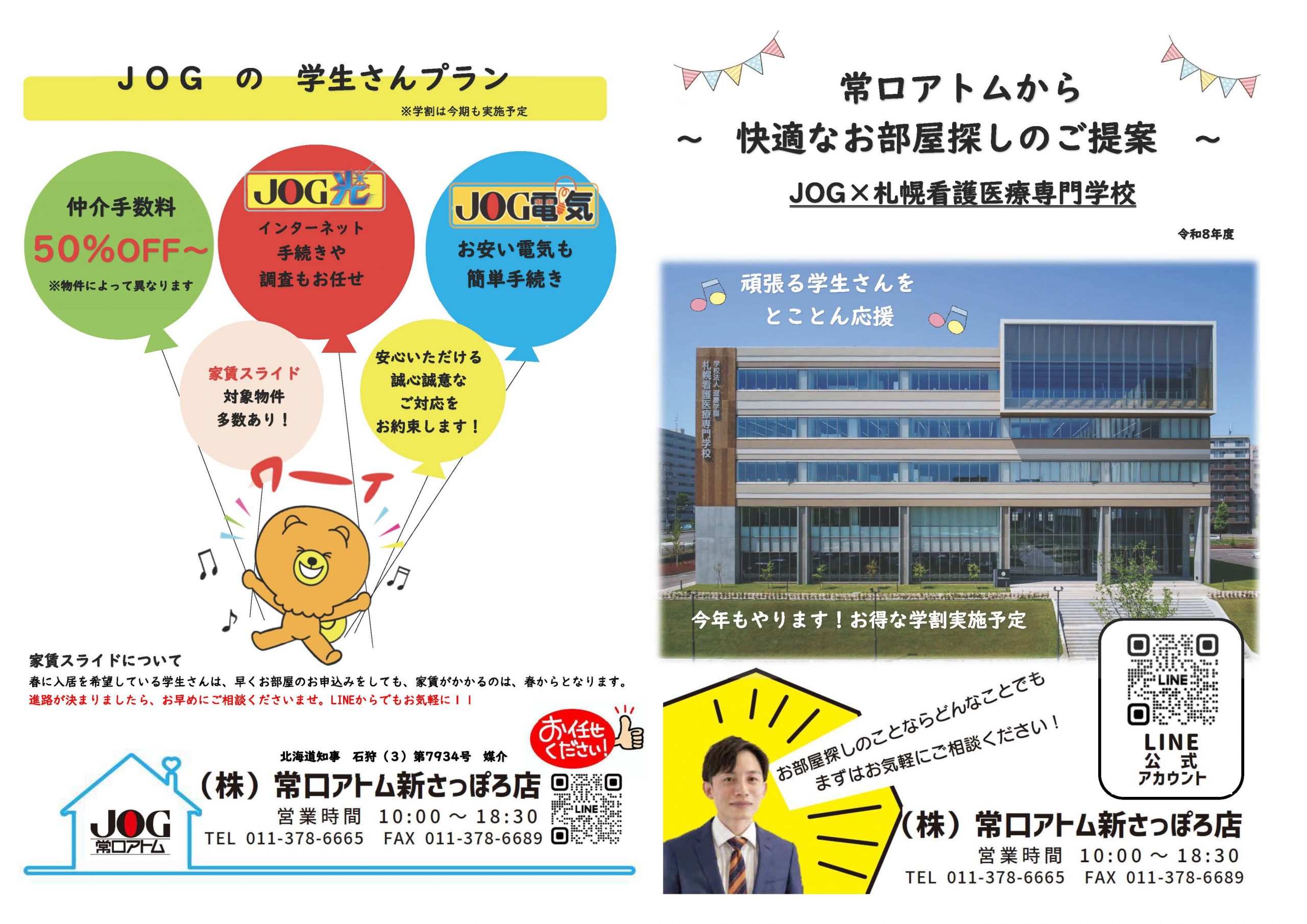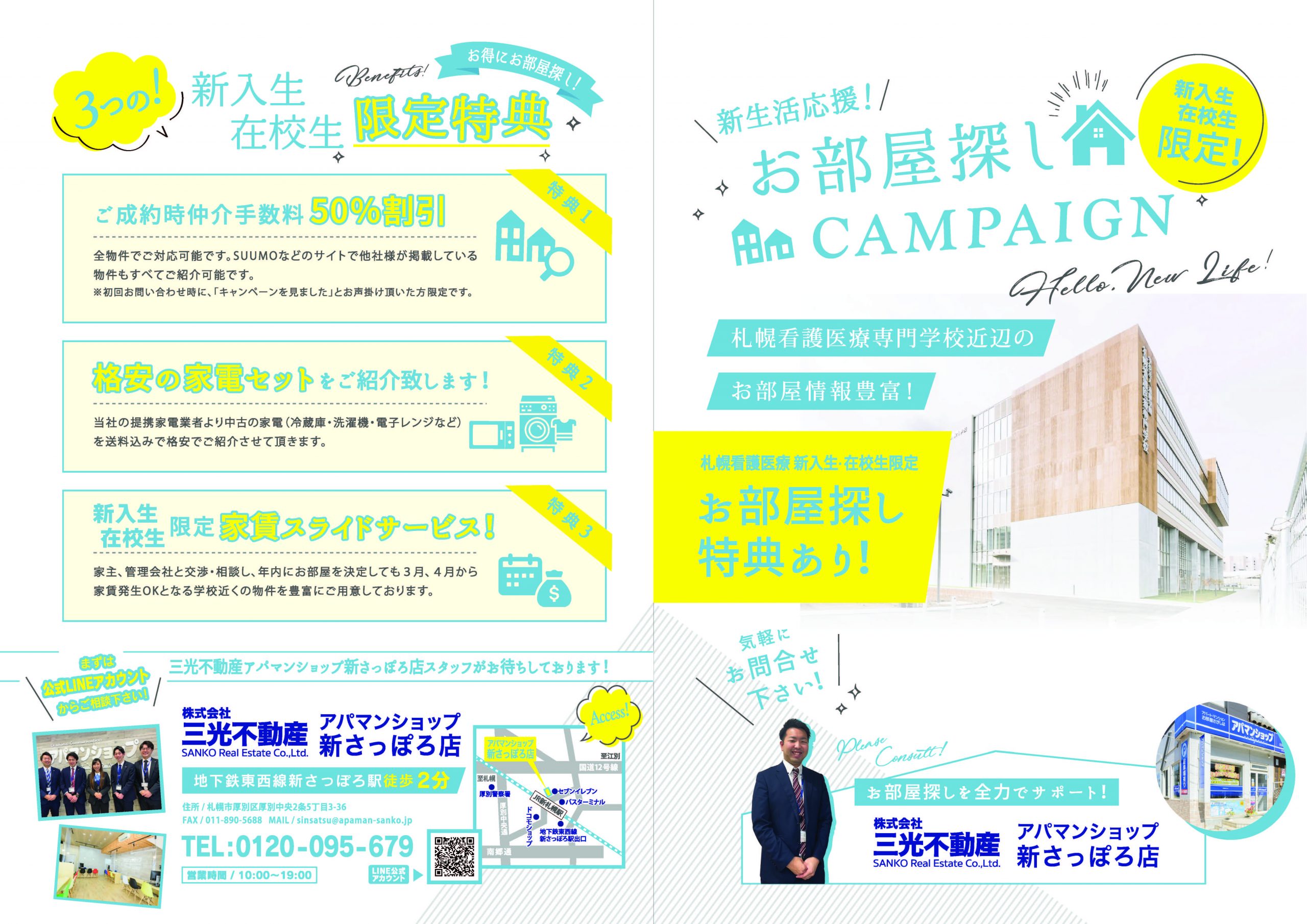 2025.10.10 【2026年4月入学生限定】Special Thanks キャンペーン詳細 各店舗の詳細は以下から確認ください^^ アパマンショップ 新さっぽろ店詳細 常口アトム 新さっぽろ店詳細 新入生限定 紹介申込フォームはこちらから ※不動産会社の担当よりご連絡させていただきます。