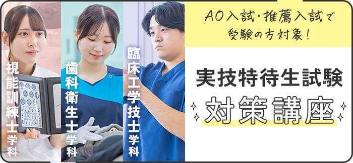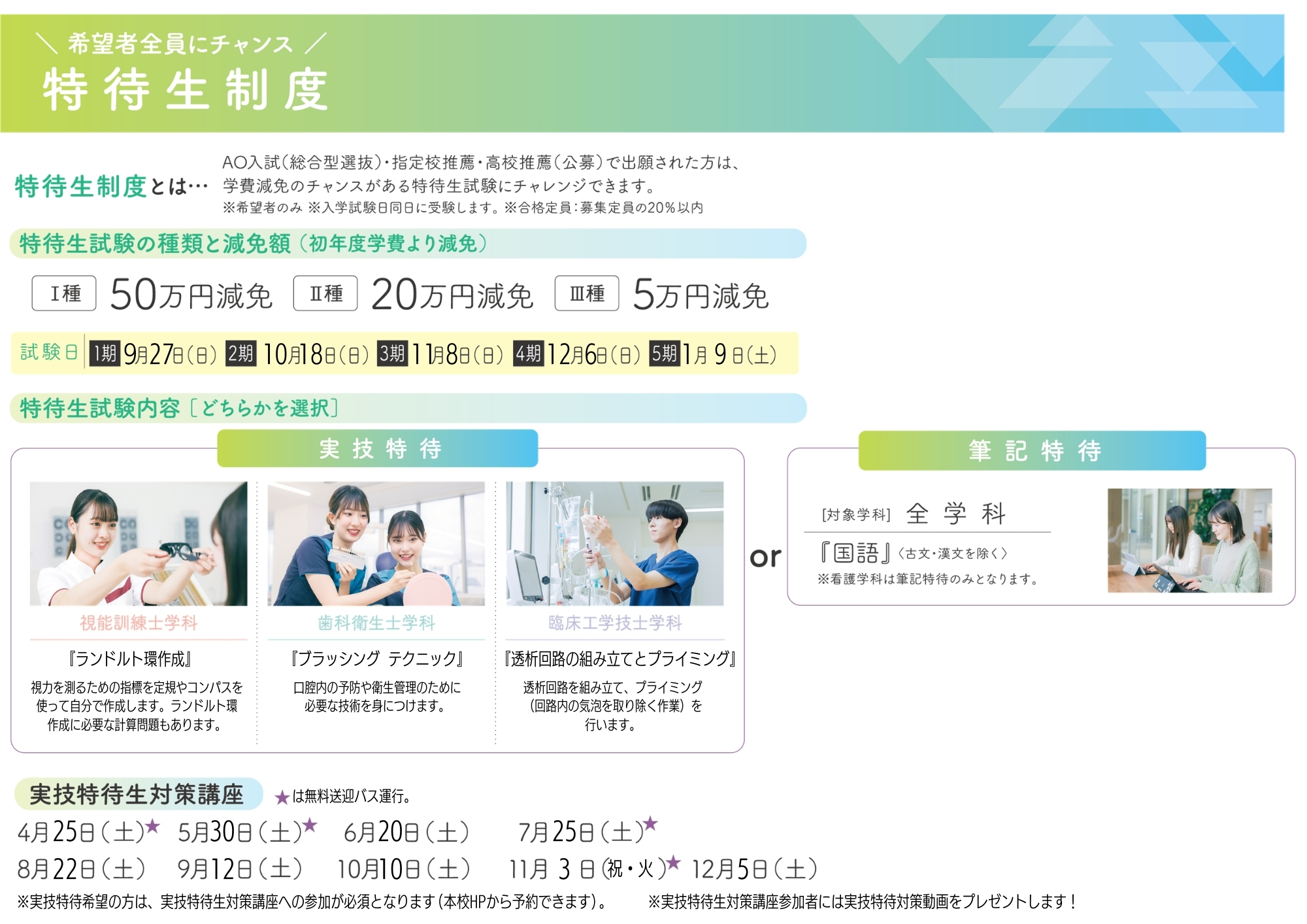視能訓練士学科・歯科衛生士学科・臨床工学技士学科でAO入試または推薦入試で受験の方は特待生試験の受験が可能です。